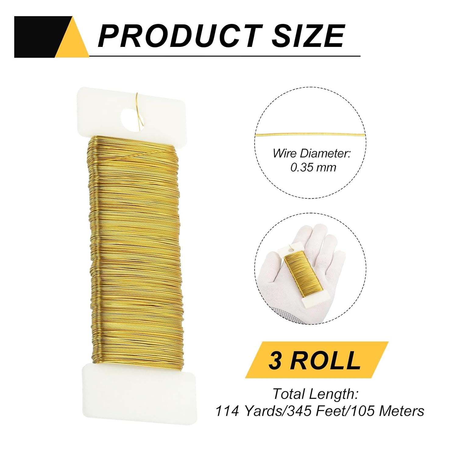 - Color: Gold Tone; Material: Aluminum; Total Length: 114 Yards/345 Feet/105 Meters; Diameter: 0.35mm/27 Gauge; In the package of: 3 Roll Metal Floral Wire (38 Yards/ Roll)