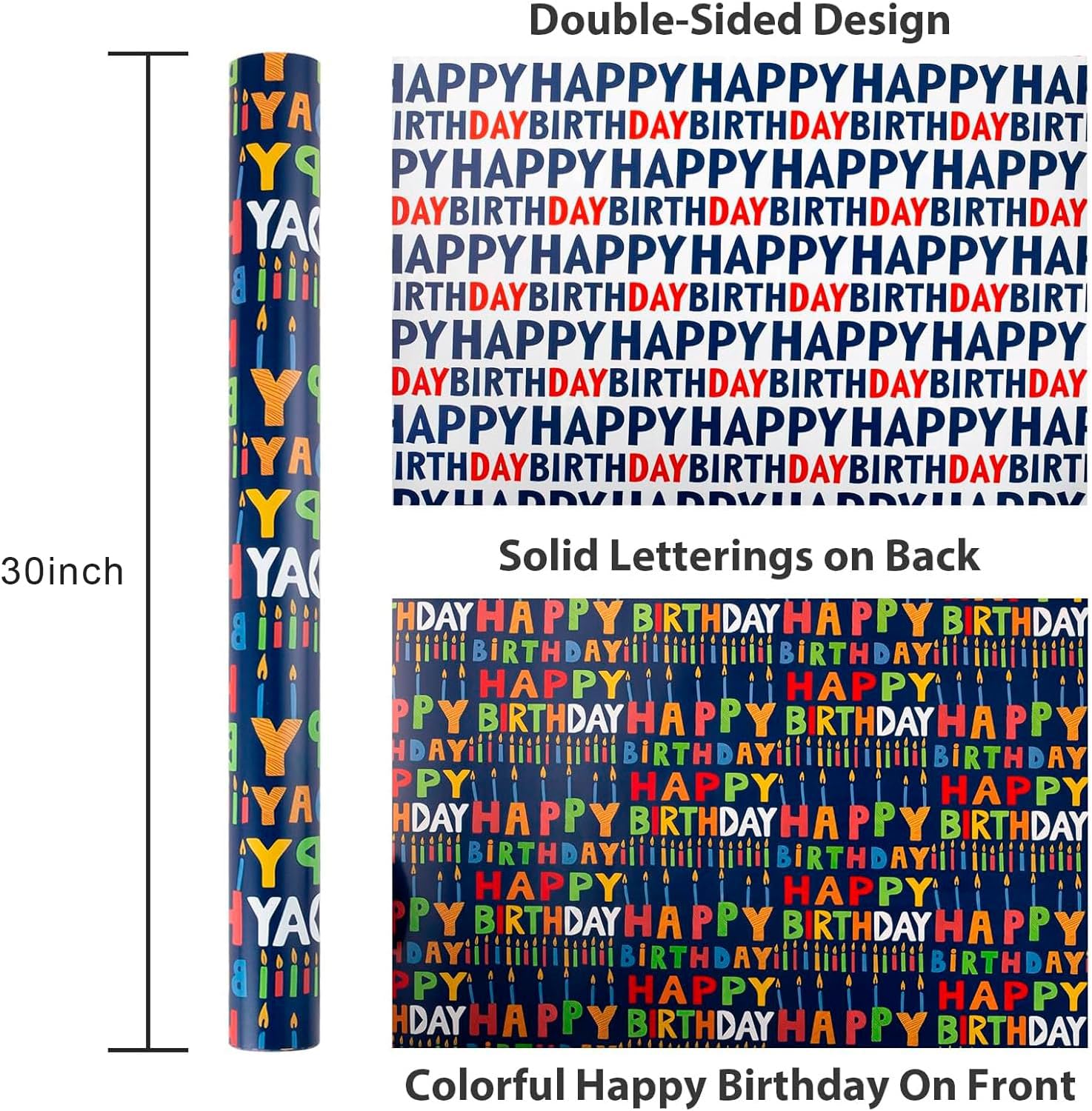 Yarcony Reversible Birthday Wrapping Paper Roll - 17 Inch X 16.5 Ft(23.4 Sq.Ft.Ttl) - Creative Colorful Happy Birthday Lettering & Candle Navy Blue Gift Wrap for Party, Baby Shower & Holiday