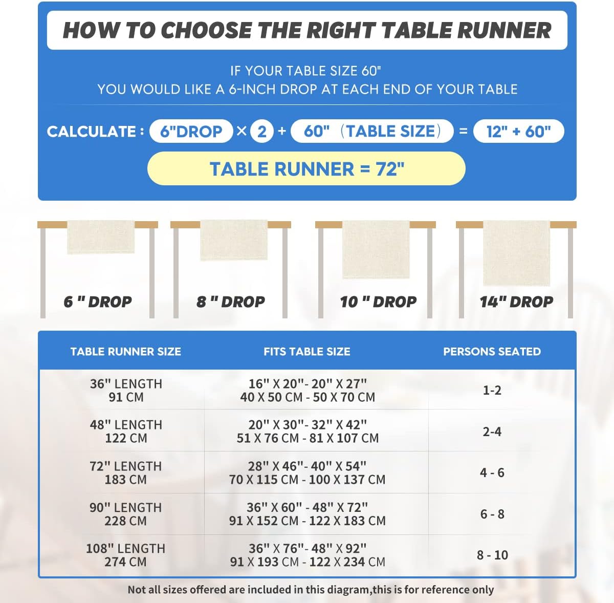- Fits Table Size : This table runner is 12 x 48 inch, appropriate for a table that can seat 2-4 people, better match your table and give you a delightful dining experience