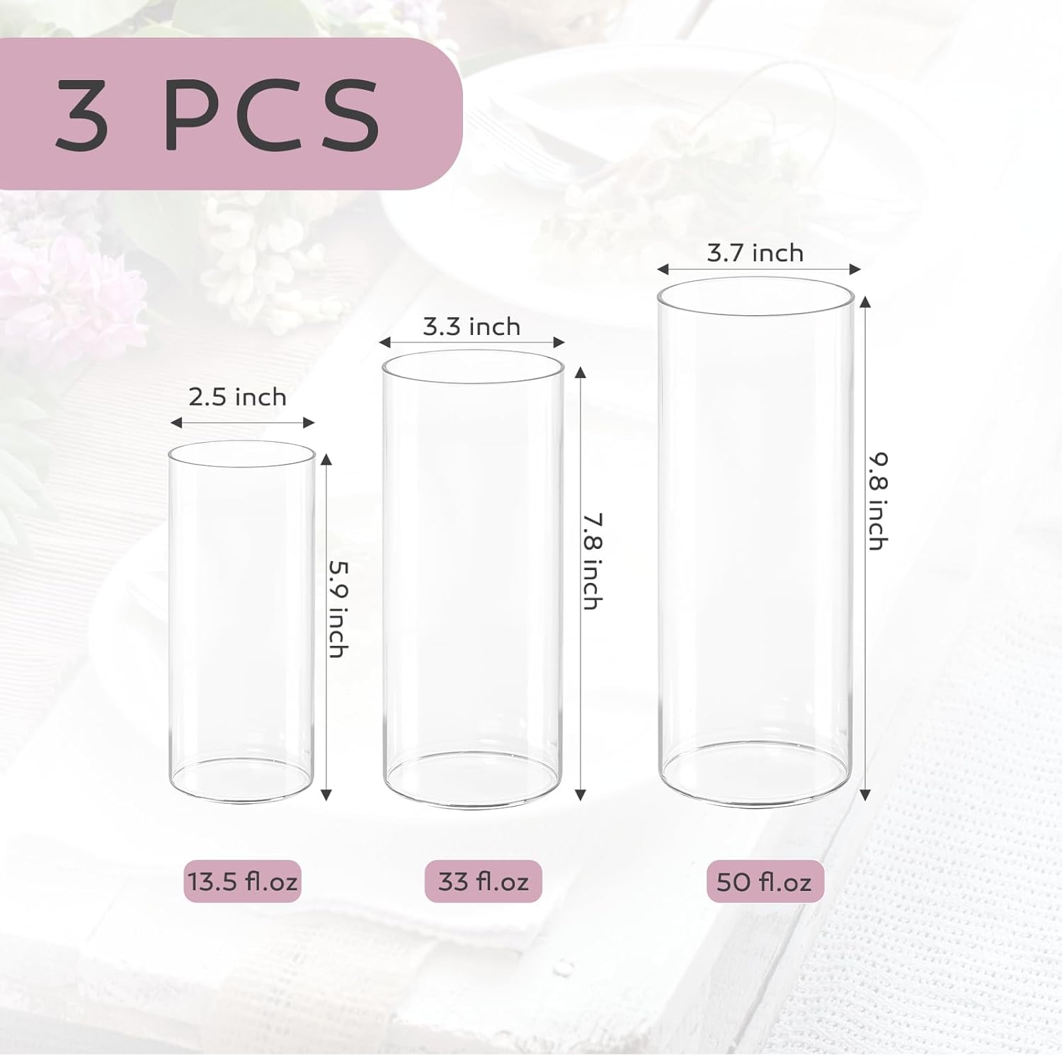 - Multiple applications: Create stunning tablescapes with 3 versatile cylinder vases (6",8",10"). Use the 6" as bud vases for single peonies, the 10" as flower vases for centerpieces with cascading orchids, or arrange all three with floating candles and rose petals for holiday dinners