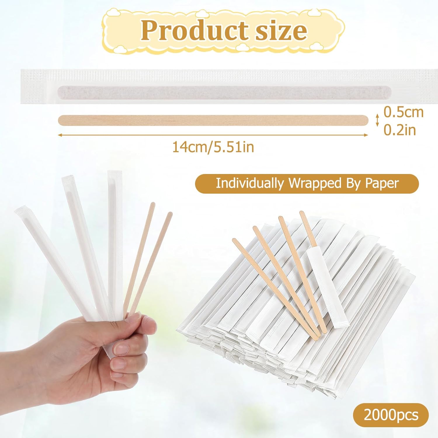 2000 Pcs Individually Wrapped Wooden Coffee Stirrers 5.5 Inch Disposable Wood Stir Sticks, Round End coffee stirrer for Cocktail, and Hot Drinks