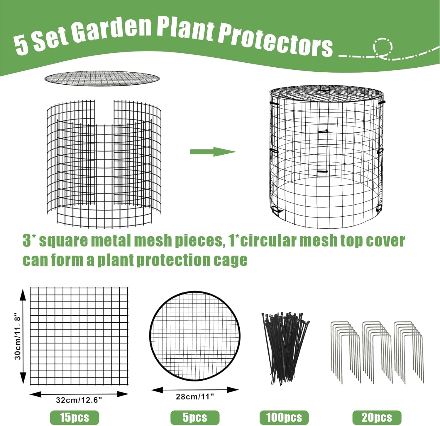 - You Will Get: You will receive 5 sets of wire plant protectors, each wire mesh size is 11.8 inches high x 12.6 inches wide, including 15 pack metal mesh pieces, 5 pack round mesh top covers, which size is 11 inches, 20 x fixing stakes, and 100 x ties, you can combine 6 or more grids to get larger plants, which will provide enough space for plant growth space
