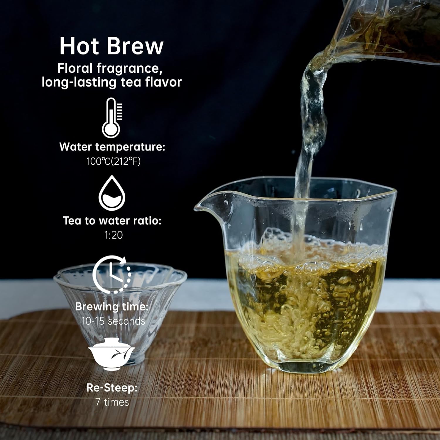 - Hot and Cold Brewing: Hot brewing 1. Chinese method: 5g of tea leaves to 100ml of water, brew at 100°C for 10-15 seconds, then add 5 seconds for each subsequent brew; 2. Western method: 1g of tea leaves to 100ml of water, brew at 100°C for 1-3 minutes. Cold brewing: Add 100ml of mineral water per 1g of tea leaves, refrigerate for 4-6 hours to release the fresh jasmine aroma, offering a two-in-one drinking experience!