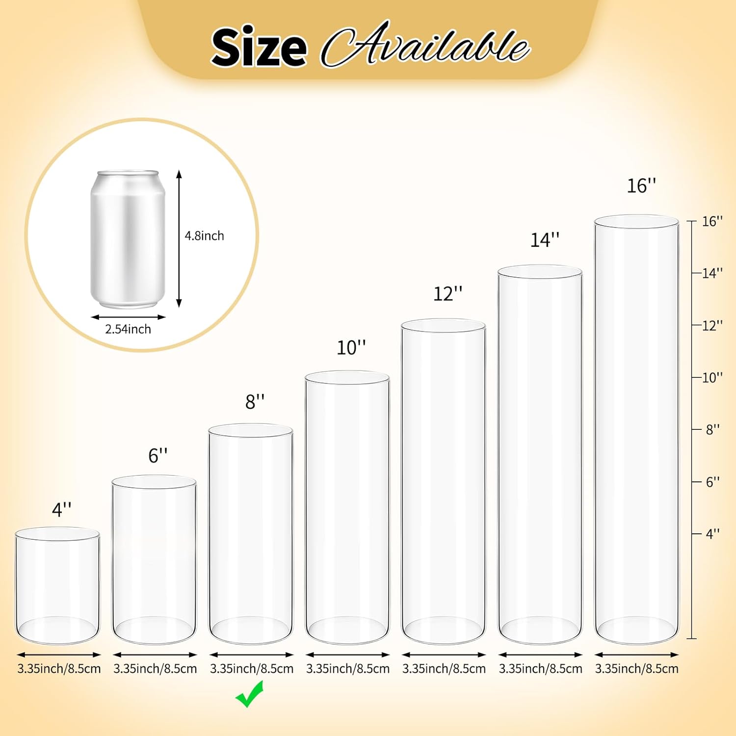 - ✅ Classic Cylinder Vase: This vase set contains 12 pack clear cylinder vases, the height is about 8 inch and the diameter is about 3.35 inch. Our glass vases are available in sizes from 3.35*4" to 3.35*16", ideal for various flower vases, vases for centerpieces, and candle holders. Its versatile uses makes it perfect for creating elegant centerpiece table decorations.