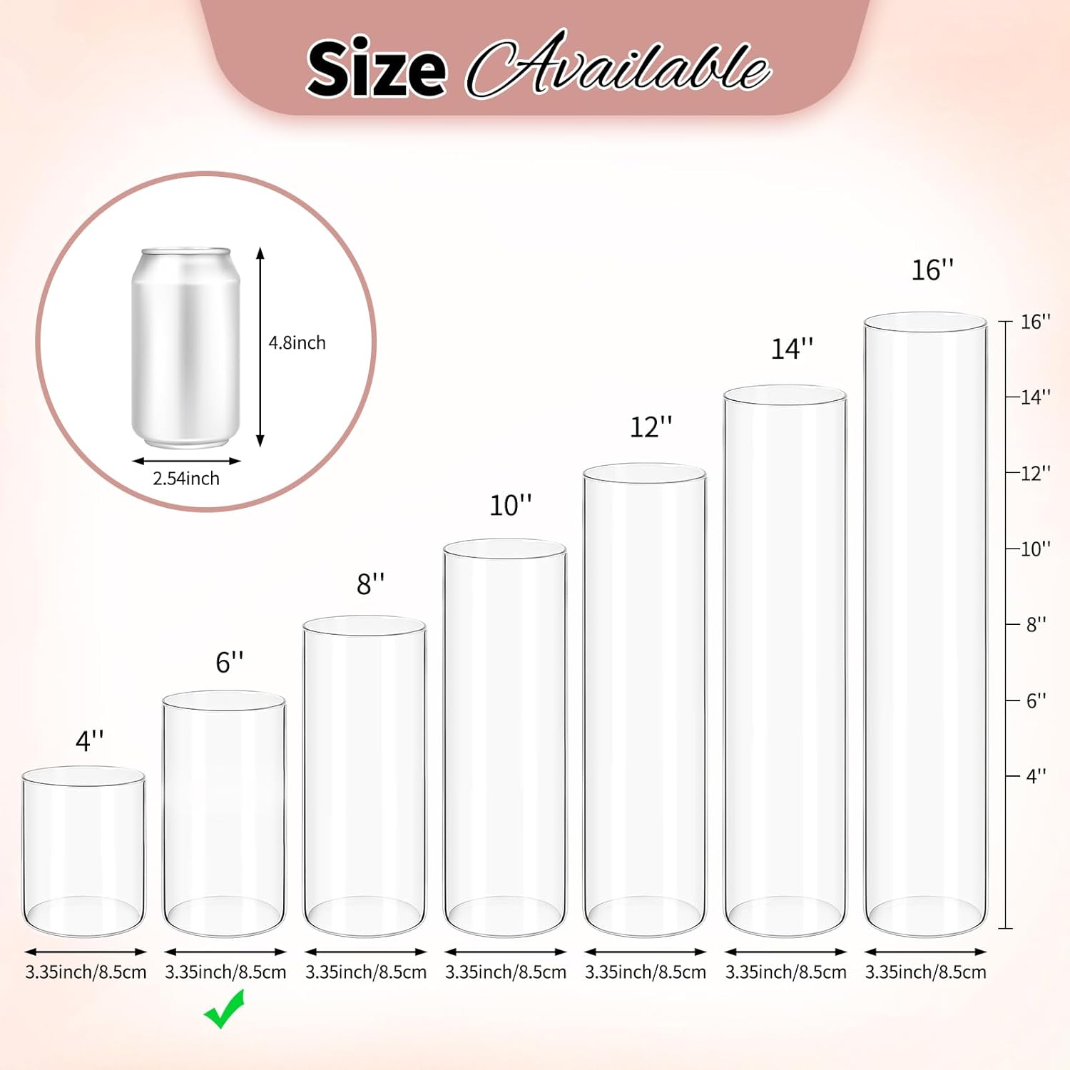 - ✅ Classic Cylinder Vase: This vase set contains 12 pack clear cylinder vases, the height is about 6 inch and the diameter is about 3.35 inch. Our glass vases are available in sizes from 3.35*4" to 3.35*16", ideal for various flower vases, vases for centerpieces, and candle holders. Its versatile uses makes it perfect for creating elegant centerpiece table decorations.