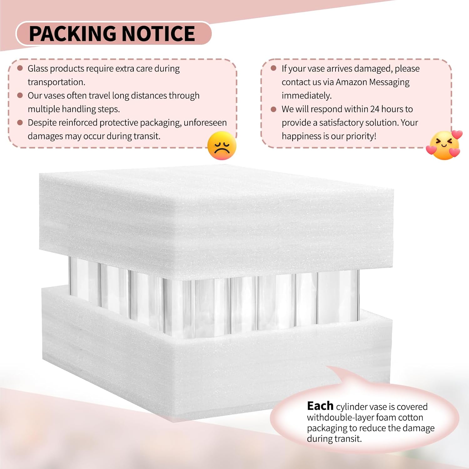 - ✅ Safe Package: Each glass cylinder vase arrives carefully protected with dual-layer foam cotton to prevent transit damage. But if anything arrives less than perfect? No worries. Just message us via Amazon—we’ll respond within 24 hours and make it right. Your happiness is our priority!