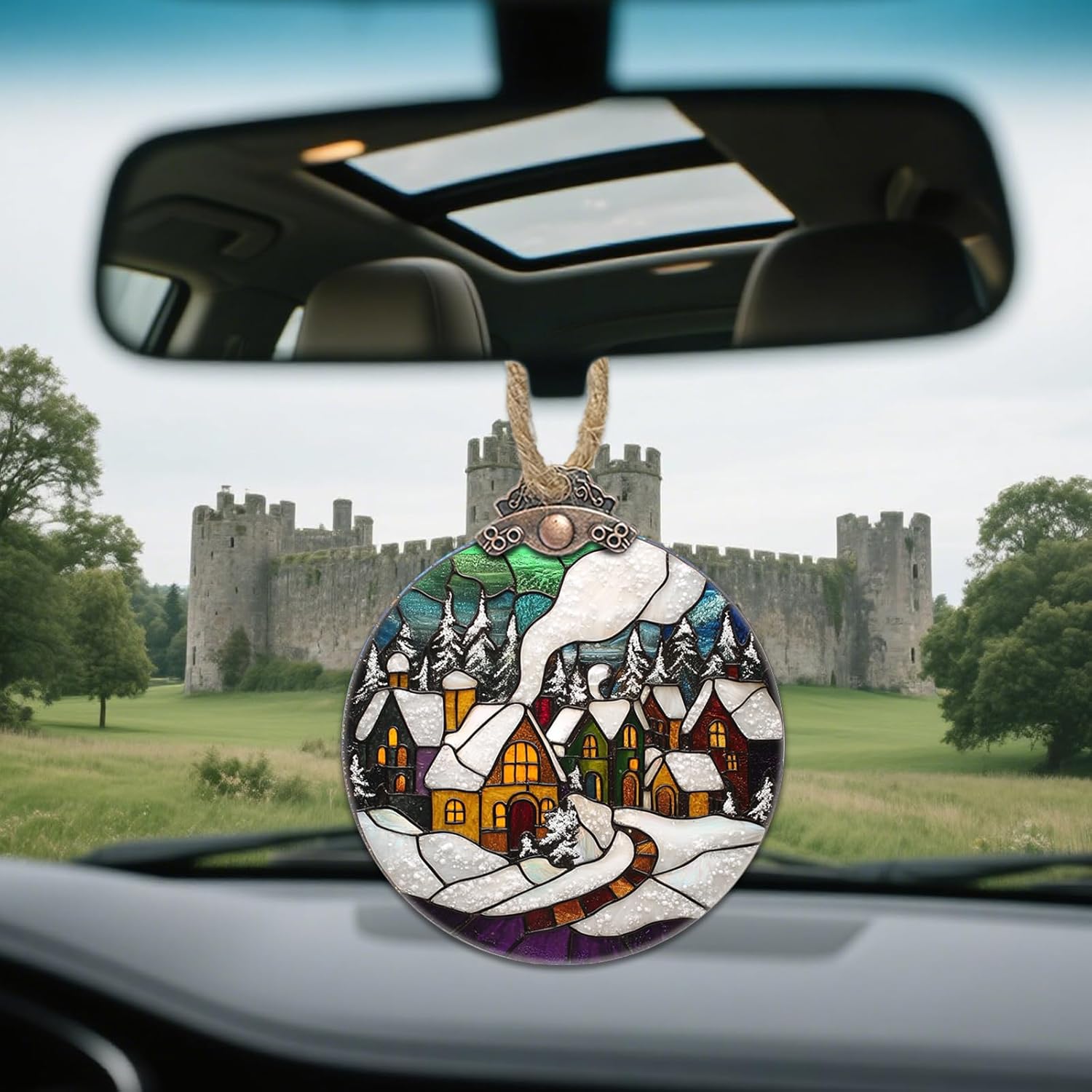 Stained Glass Christmas Decorations, Winter Snow Cabin Suncatcher for Window Christmas Tree Hanging Ornaments Retro White Sun Catcher Xmas Decor Gifts for Women Men Mom Nana Friend