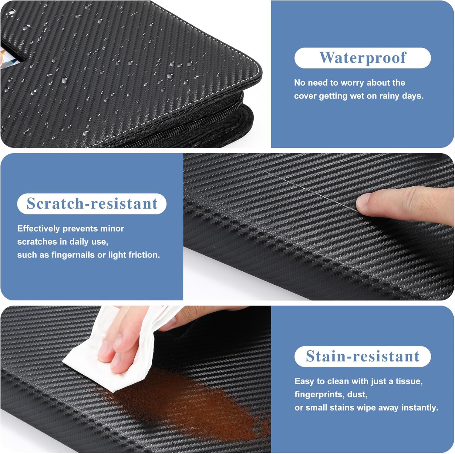 - Waterproof PU Leather Card Binder: The card binder for trading cards is crafted with waterproof PU leather, making it resistant to spills, dirt and staining. Whether itβs an accidental drink splash, fingernail marks, or daily dust, the card binder protect your TCG, MTG, YGO, photo, baseball, and sports cards from fading and stain.